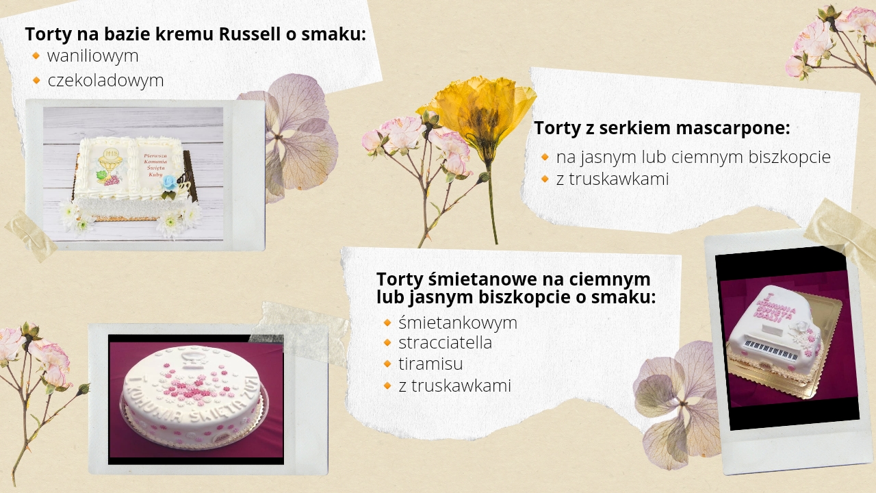 Sezon komunijny w pełni! Niezależnie od tego czy przygotowujemy obiad tylko dla najbliższej rodziny, czy większe przyjęcie, warto zwieńczyć to wydarzenie pięknym tortem. Zapraszamy do zapoznania się z naszą ofertą – wykonujemy torty na ciemnym lub jasnym biszkopcie, w kilku smakach, o różnych wariantach wykończenia (wiórki kokosowe, serek mascarpone, masa cukrowa). Zamówienia przyjmujemy telefonicznie i osobiście w naszych cukierniach – zakładka kontakt. Zachęcamy także do obejrzenia galerii tortów.